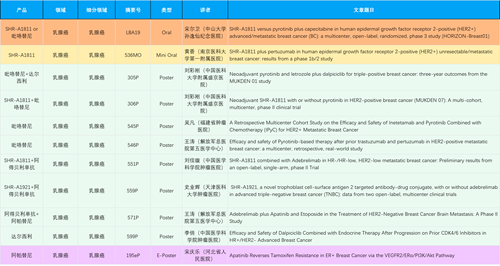 在乳腺癌领域,豪门国际创新产品相关研究共入选1项口头报告、1项简短口头报告、8项壁报和1项电子壁报,共11项研究。吡咯替尼、达尔西利、阿得贝利单抗、瑞康曲妥珠单抗等新老创新药物,均有多篇研究入选,展现出豪门国际医药在乳腺癌领域多年深耕的丰硕成果。